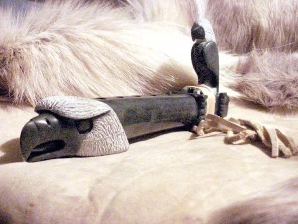 This eagle flute is carved from a single piece of Steatite from the coast of Washington. Stone flutes are an ancient tradition from the Incas, Aztecs, and at least one Lakota man who made stone flutes up until 1928. This tradition has died out. The flutes that I make are the only ones I know of that are made of stone.